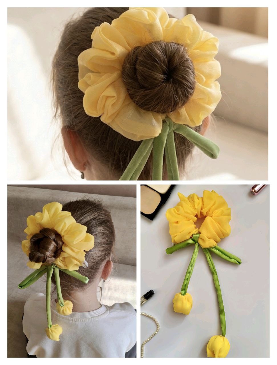 Яскравий жовтий скранч з декоративними тюльпанами додає образу тепла та настрою. Об’ємний аксесуар красиво виглядає як на пучку, так і на хвості. Ідеальний для щоденного використання та святкових образів.