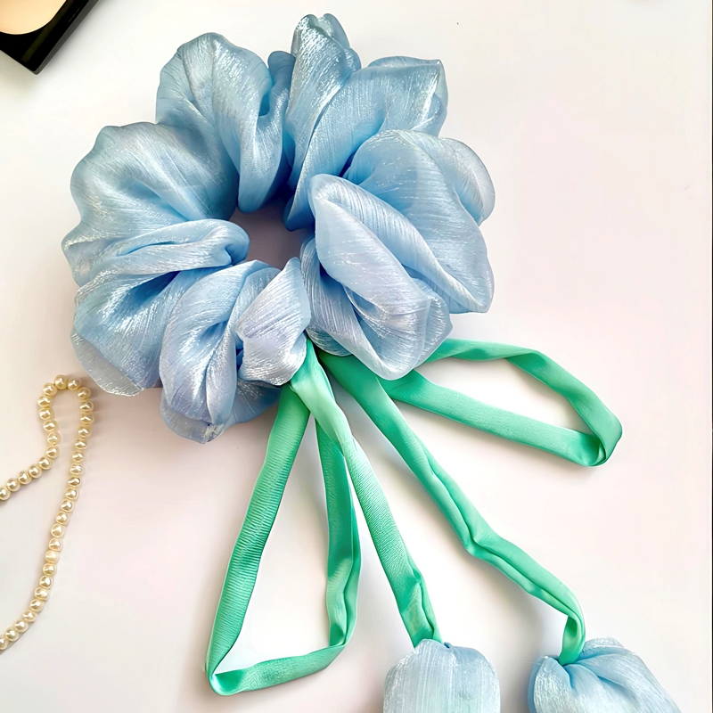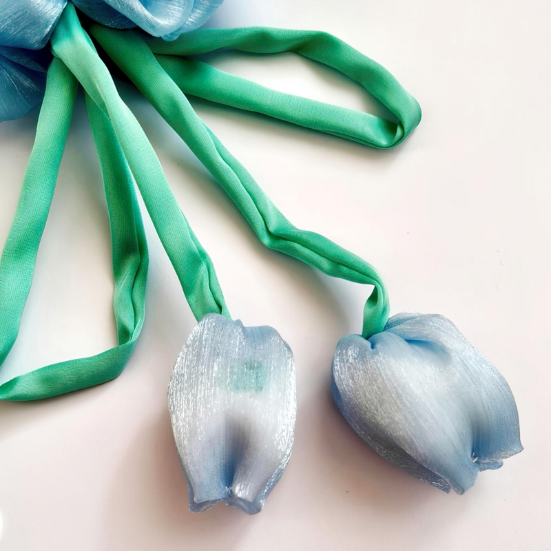 Ніжний голубий скранч з декоративними тюльпанами — стильний аксесуар для волосся ручної роботи. Об’ємний дизайн красиво виглядає на хвості або пучку та додає образу легкості і ніжності. М’яка тканина дбайливо фіксує волосся і не травмує його, тому підходить для щоденного використання.