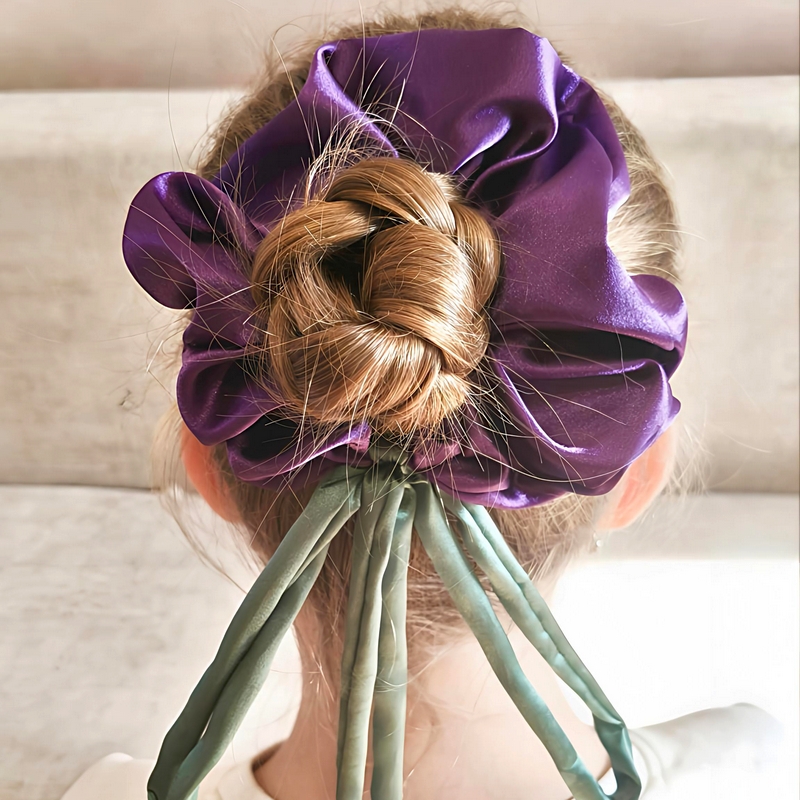 Стильний фіолетовий скранч з декоративними тюльпанами — елегантний аксесуар для волосся ручної роботи. Об’ємний дизайн красиво виглядає на хвості або пучку та додає образу виразності. М’яка тканина дбайливо фіксує волосся і не травмує його, тому підходить для щоденного використання.