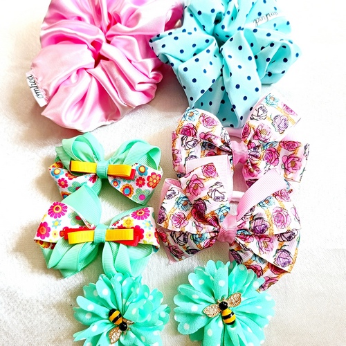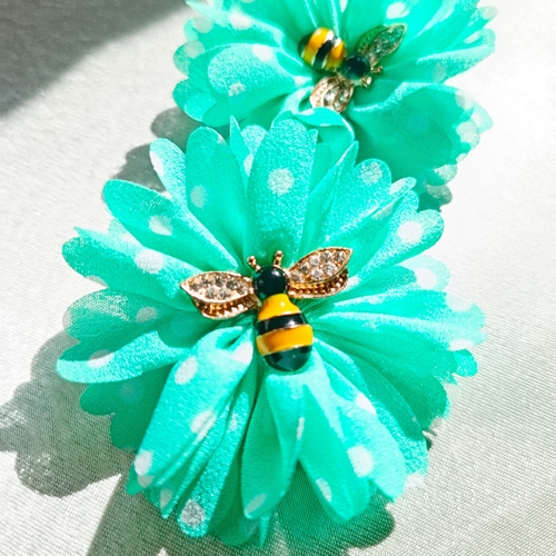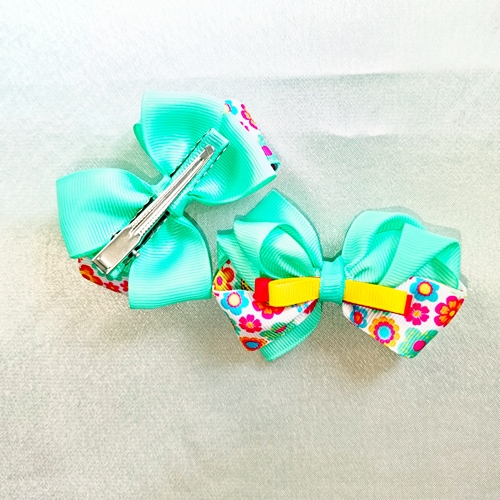 Дві заколки мятного кольору з яскравим квітковим принтом та жовтими акцентами